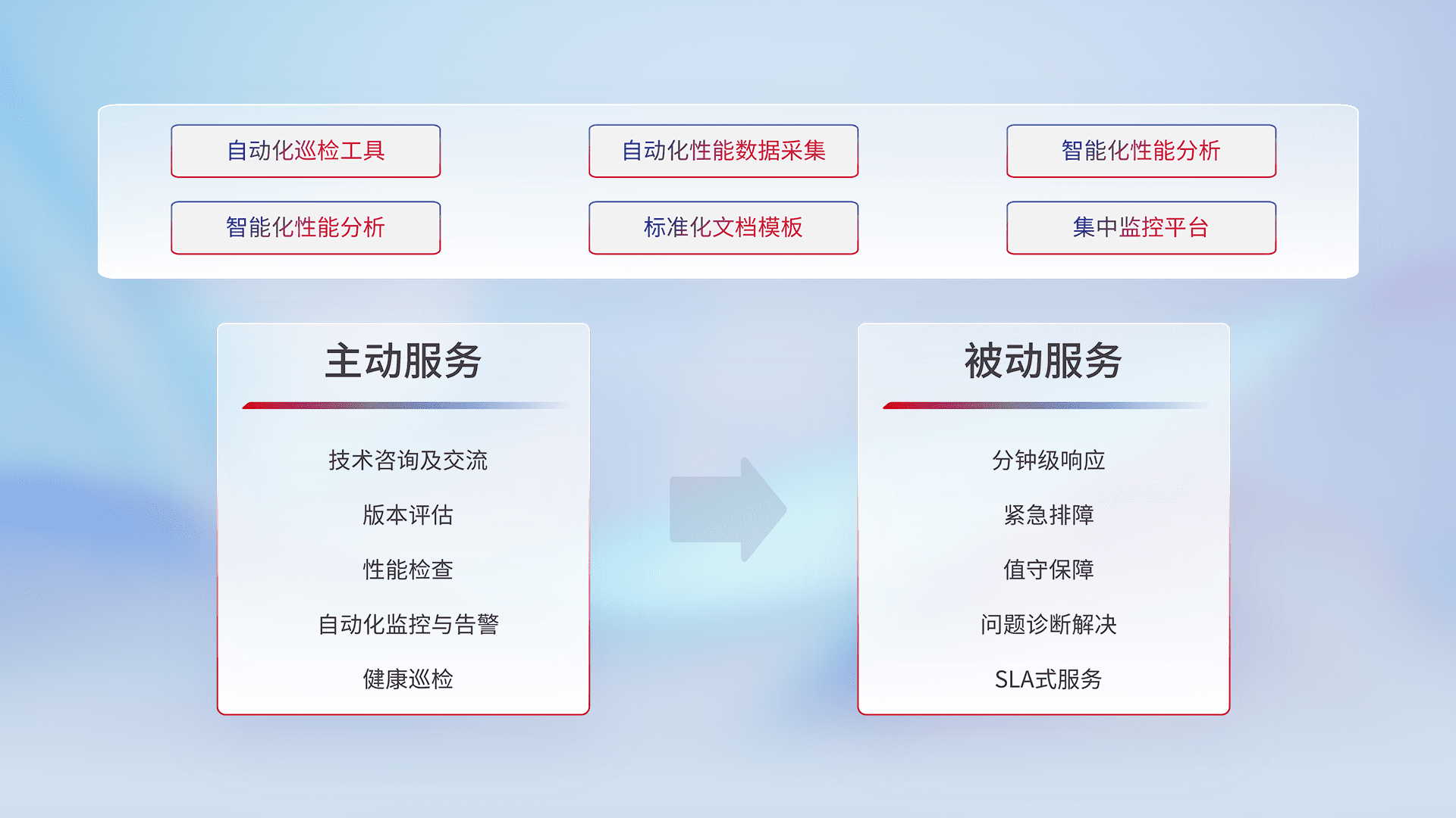 智能化工具和标准化文档,,,保障服务质量,,提供主动服务(包含技术咨询、、、版本评估、、性能检查、、、自动化监控与告警、、、、健康巡检)和被动服务包含(分钟级响应、、紧急排障、、、值守保障、、、、问题诊断解决、、、、SLA服务)。。。